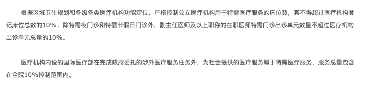其次,国际医疗部作为国内医院的特需服务,规模受到政策严格限制,即不得超过医院总服务量的10%。以2021年发布的《北京市卫生健康委员会关于 加强和规范北京市公立医疗机构特需 医疗和国际医疗服务管理的通知》为例,其中就明确标明: