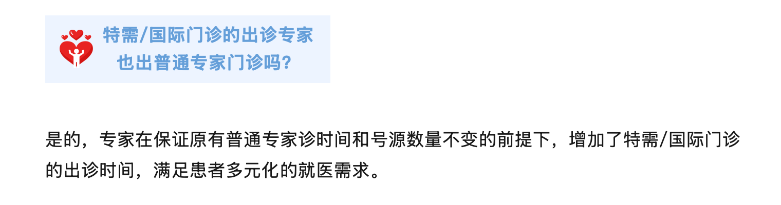 医院专家在保证原有普通专家诊断时间和号源数量不变的前提下,增加了特需/国际门诊的出诊时间。